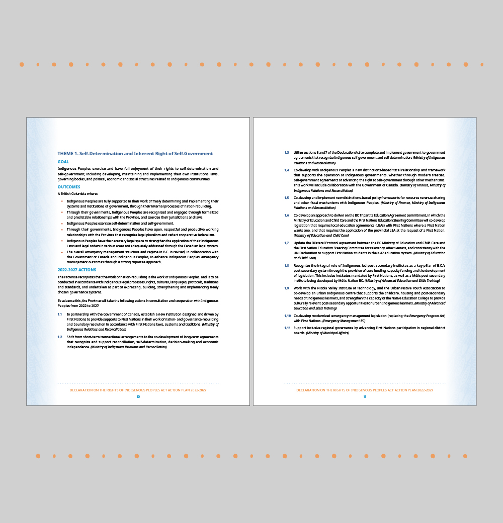 The Declaration Act Action Plan includes collectively identified goals and outcomes that form the long-term vision for implementing the UN Declaration in B.C. The plan contains 89 priority actions - tangible steps that will advance this work in key areas over the next five years.